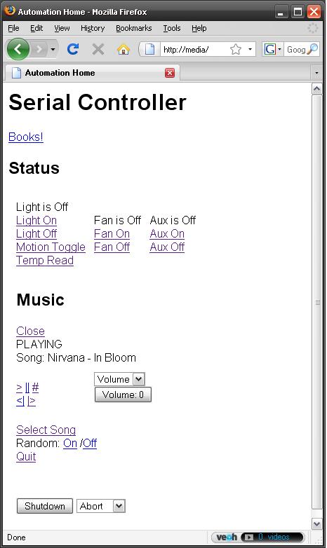 ![]() | This is the interface for my home automation system. It's really only about half finished. Currently working are three general purpose on/off outputs and a media player the plays over the house stereo instead of the computer loading the page so I can queue up music from anywhere in the house. On the list of things to do: add a scheduler page to have the ports turn on and off at specified times, finish the tempurature sensor and integrate it with the thermostat so I can set the tempurature from anywhere, and lastly, add an IR transmitter so I can control my TV/Stereo/Whatever that uses a remote. |