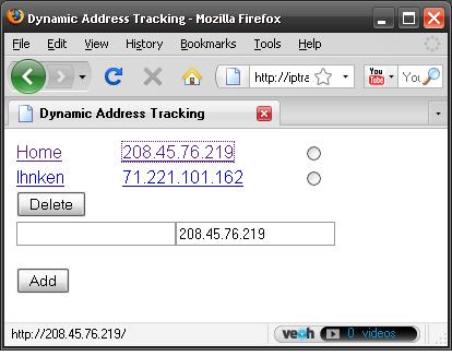 ![]() | Here's a page that I've built to track 1)the IP of my home network so that I can get to my automation server from anywhere and 2)the IP of anywhere else I need to. Right now I just have Internet Explorer open a page that has a Javascript page reload that opens the update page, but I'm working on a program that will do this at a preset interval and be able to handle dead connections, like when Qwest shits out, which it does early and often >:( . |