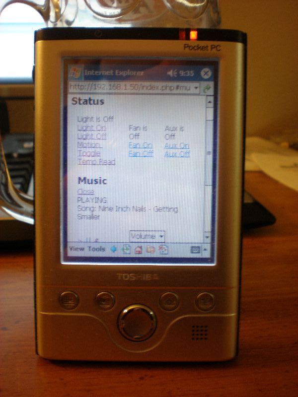 ![]() | This is my "remote" for the shambles that is my home automation system. Basically it's a Pocket PC that has WiFi that browses to my webserver which then forwards commands to my network attached IO device. |