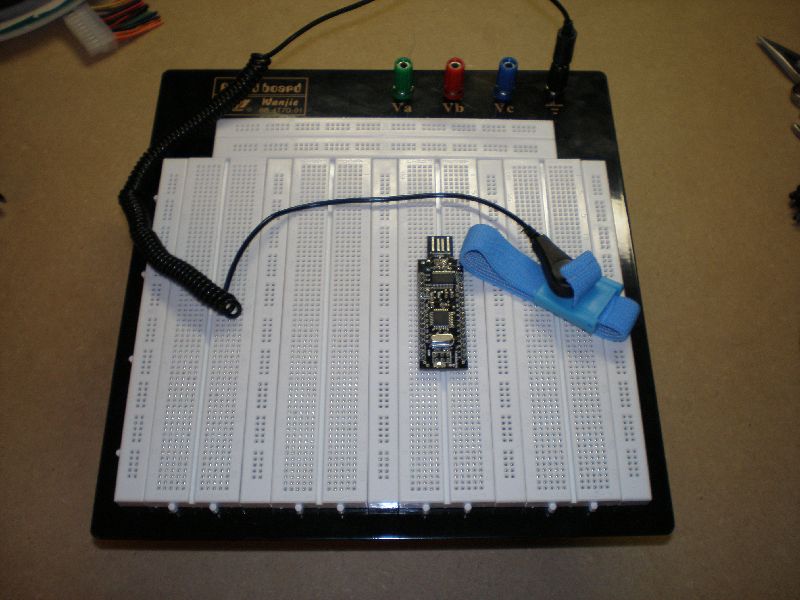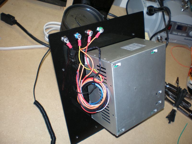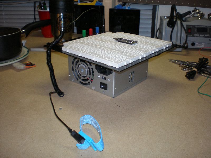 ![]() | This is my prototyping board which I've added a PC power supply to so now I only have to plug in one cable and I get 3.3, -5, 5, -12, and 12 volts (I only have enough connectors to get the positive leads mounted). Each post is a screw terminal as well as a banana plug, making it easy to connect test equipment or a grounding strap like in the picture. View #2 View #3 |