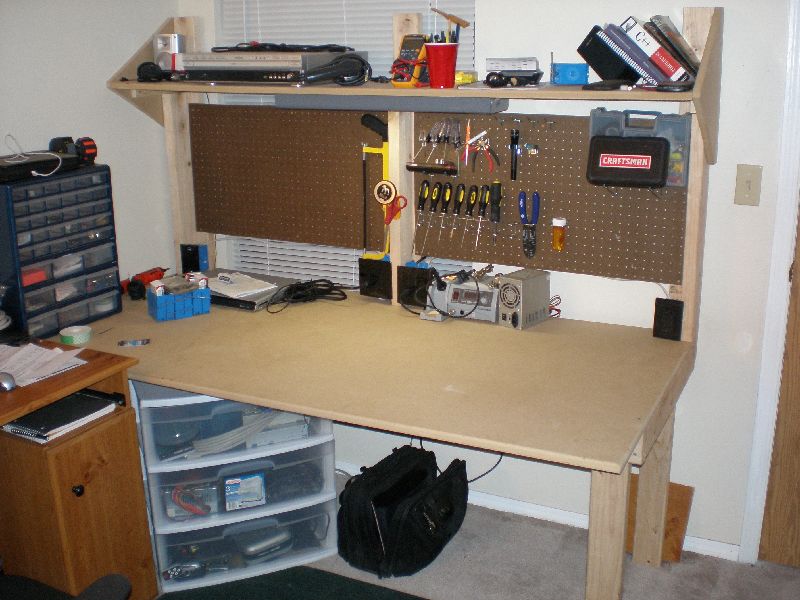![]() | This is my new workbench. It's got 16 outlets, 10 of which are on a kill switch (just in case...), and a hardwired worklamp. It has about all the space you could ever hope for with a 6x3 ft. desk area and an 18" shelf up top. |